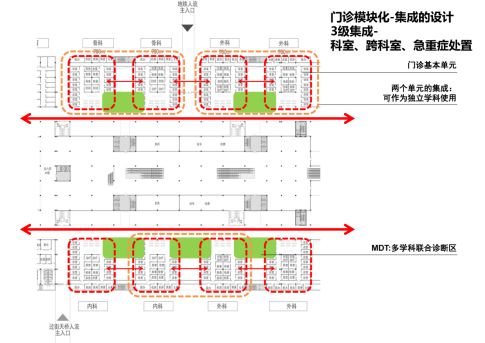 提升護理效率、共享物資供應、方便協調護理人員配置及夜間管理——采用以中央辦理大廳為核心的模塊化布局方式,門診采用科室、跨科室、急重癥處置三級集成的模塊化設計,住院采用四個護理單元集成的護理層。