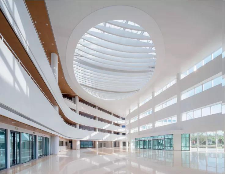 由于院區(qū)用地呈不規(guī)則的梭形,且用地處于西側(cè)城市主要交通與東側(cè)居住區(qū)的過(guò)渡區(qū)域,方案創(chuàng)新性地引入“城市客廳”的設(shè)計(jì)理念,用地中心位置的開(kāi)敞共享公共大廳不僅作為與城市、居住區(qū)進(jìn)行空間對(duì)話的形象節(jié)點(diǎn),而且將整個(gè)院區(qū)各功能自然地整合在一起。