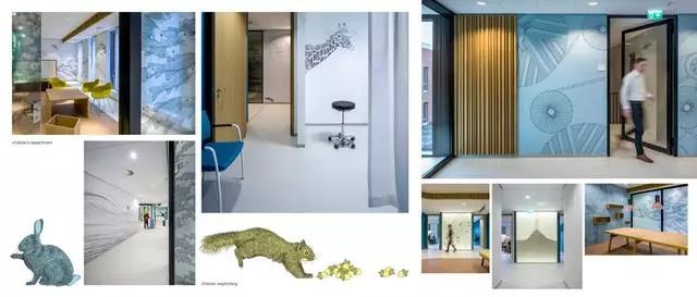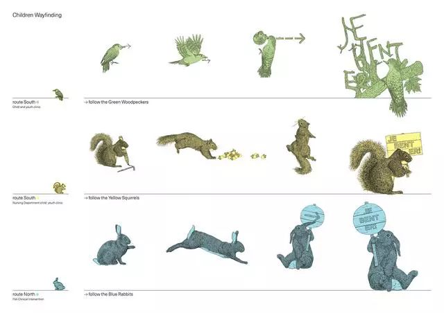 這個醫(yī)院還特別為孩子們設(shè)計了一套圖形導視系統(tǒng)。循著綠色啄木鳥、黃色松鼠和藍色兔子的腳印,去到一個個不同的醫(yī)療單元時,看病的心情或許會完全不一樣了吧。