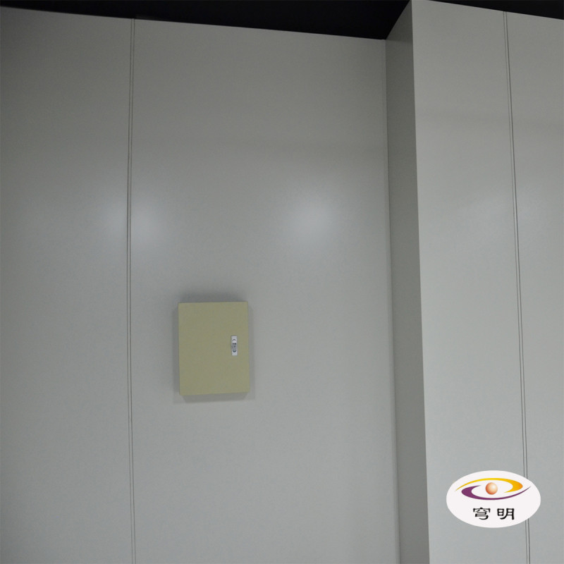 2、由一側(cè)開始安裝機(jī)房彩鋼板,依次安裝,相連板間距12mm用扣件螺絲固定,隔板之間采用寬度12mm壓條收邊,標(biāo)準(zhǔn)單元墻板均可互換。